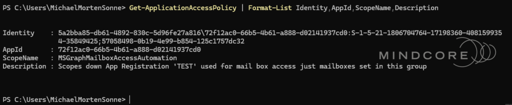 Get-ApplicationAccessPolicy | Format-List Identity,AppId,ScopeName,Description