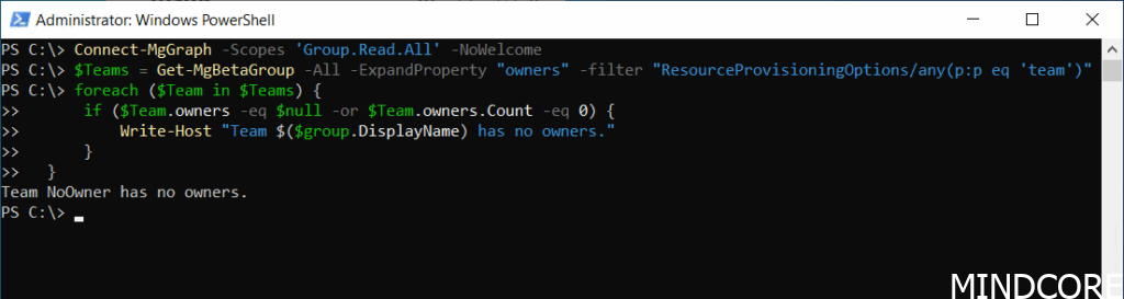 The following example demonstrates how to utilize PowerShell to identify Team sites that do not have an assigned owner.