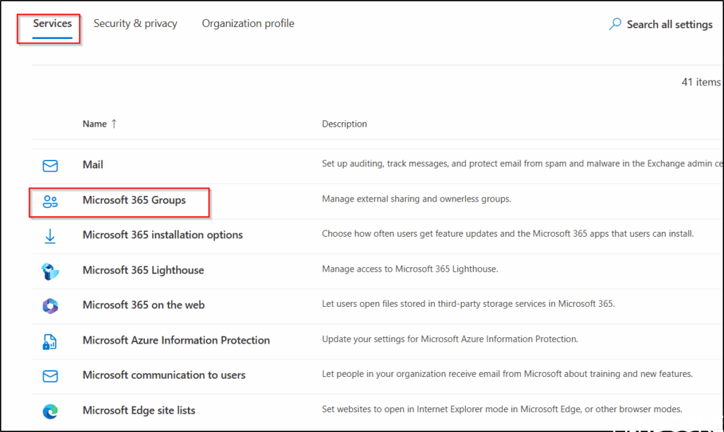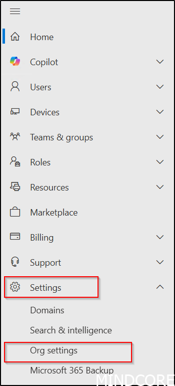 In the Microsoft 365 admin center, go to Settings and choose Org settings.