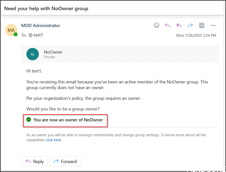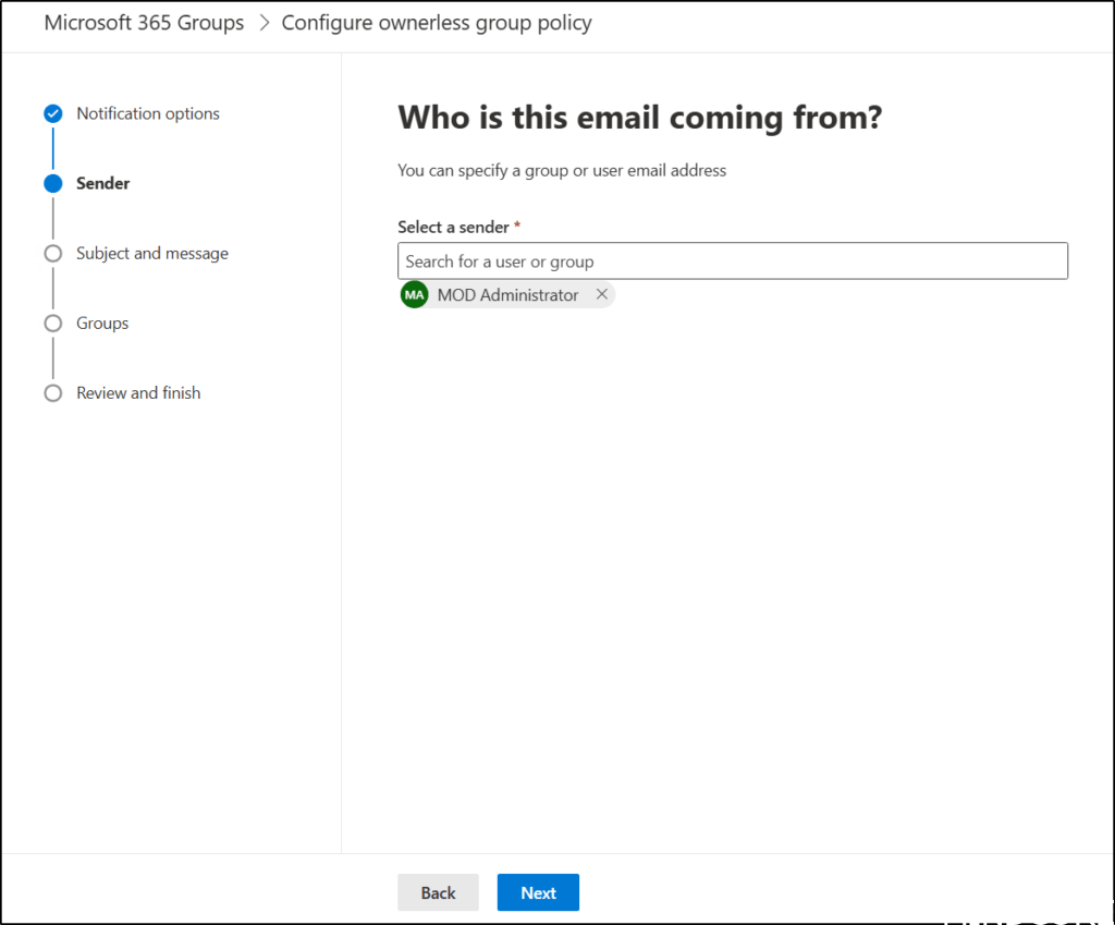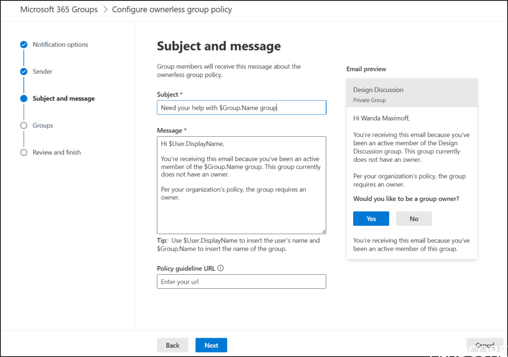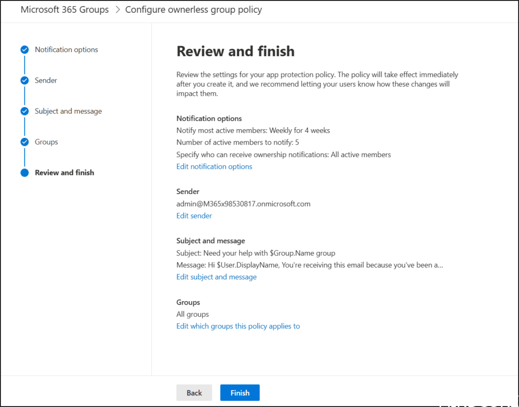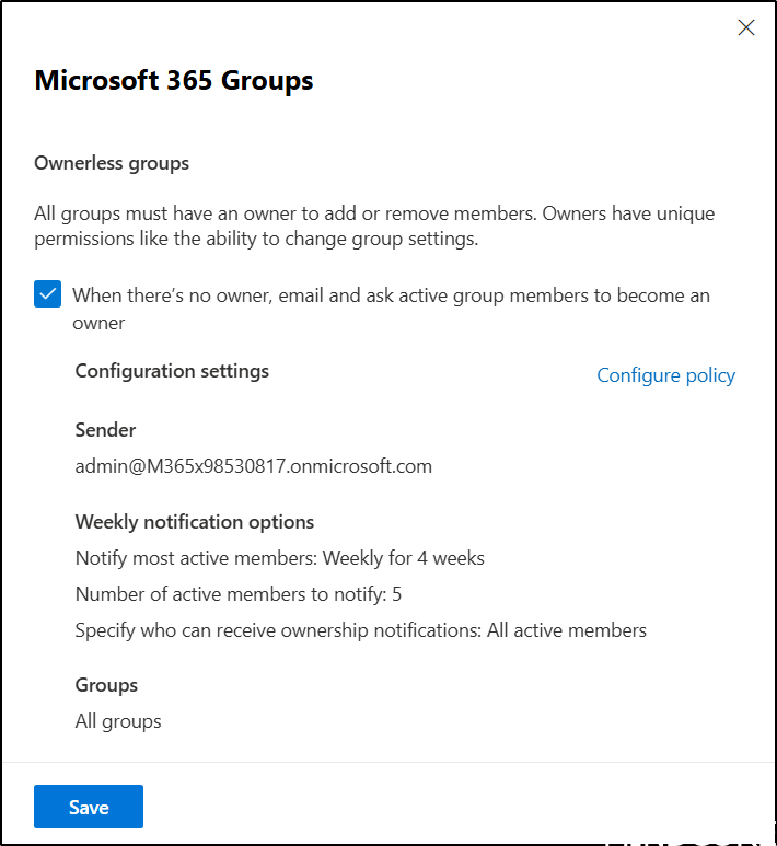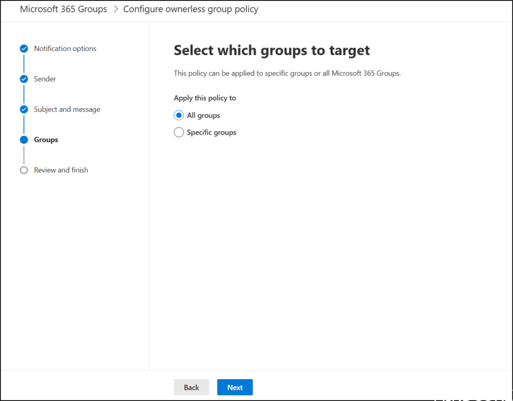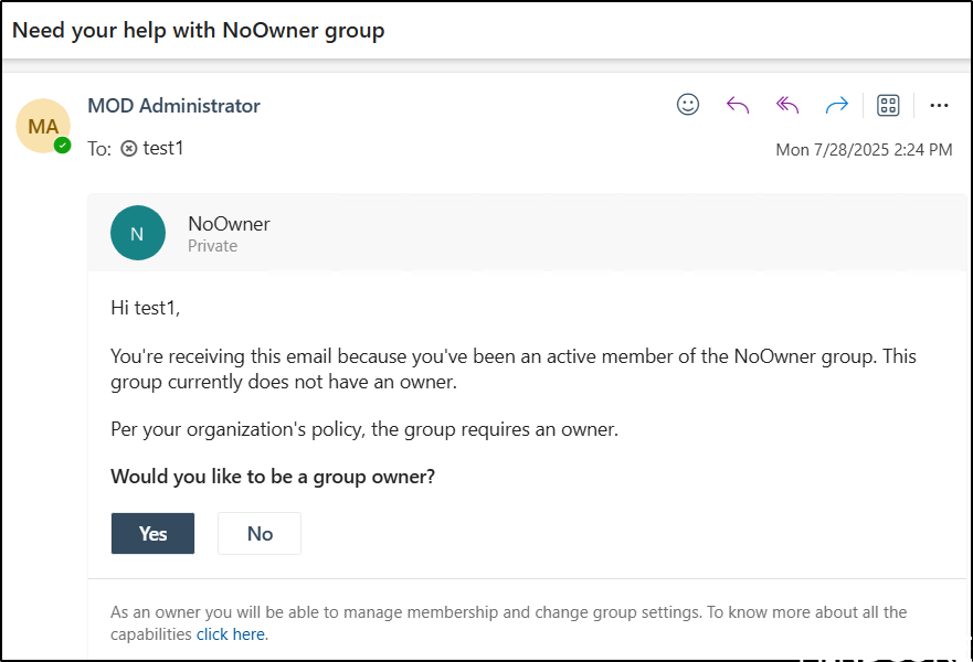 If group ownership is not accepted by the end of the notification period, notifications cease. The ownerless groups policy then takes no further action, leaving tenant administrators to assign an owner.