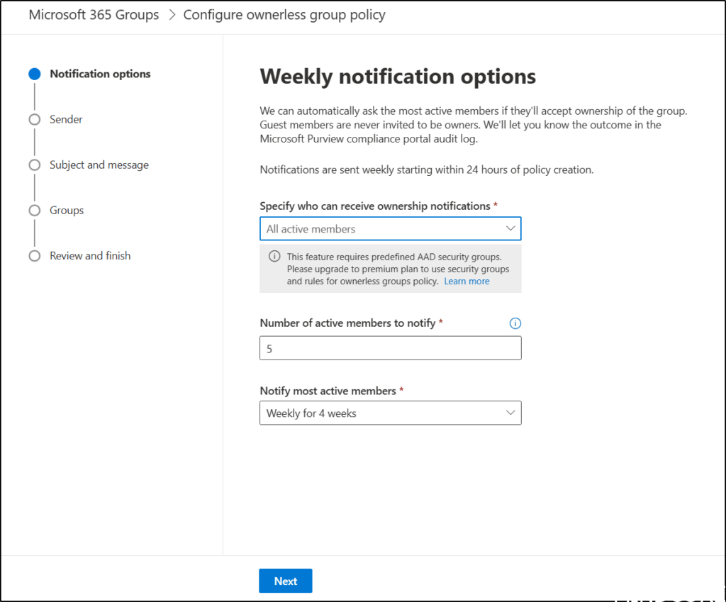 To configure and manage the Microsoft 365 ownerless group policy, Microsoft require an eligible Microsoft 365 subscription or an Azure P1 or P2 premium plan (Manage ownerless Microsoft 365 groups and teams)