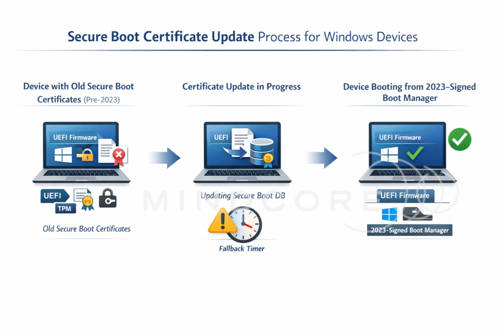 - Certificate enrollment into the UEFI DB – the Windows UEFI CA 2023 certificate is written to the Secure Boot allowed signatures database in firmware. This happens while the OS is running. When complete,