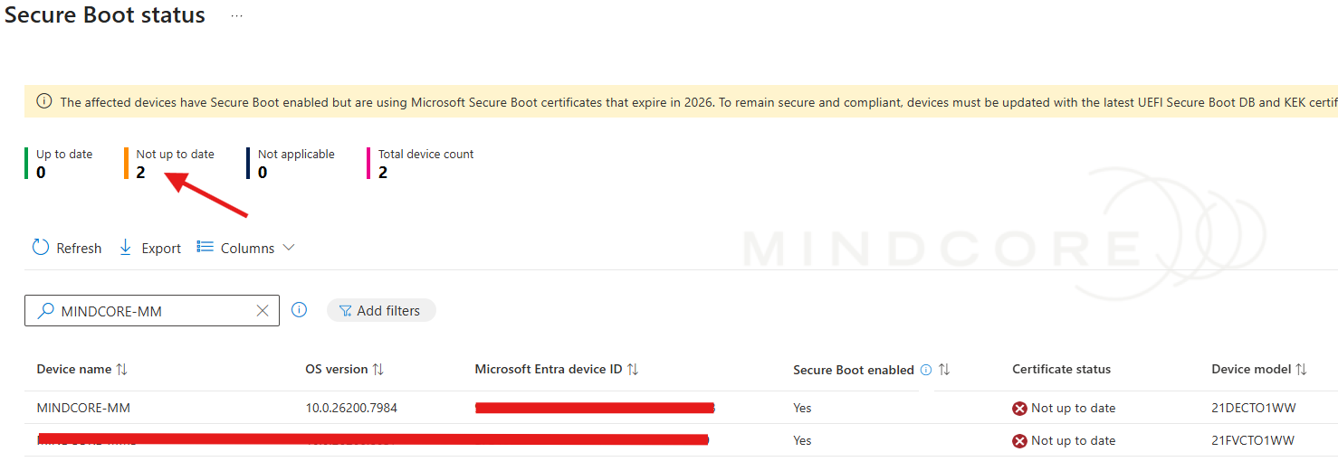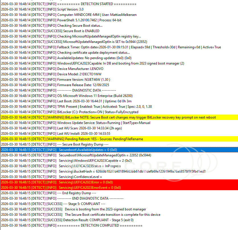 When the Secure Boot certificates change, devices with BitLocker may prompt for the recovery key on the next reboot because the PCR 7 measurements change. Verify recovery key escrow in Entra ID before triggering reboots at scale. The detection script logs a BitLocker warning for every device where protection is active. In testing on MINDCORE-MM, no recovery prompt was triggered, but treat that as a data point, not a guarantee.